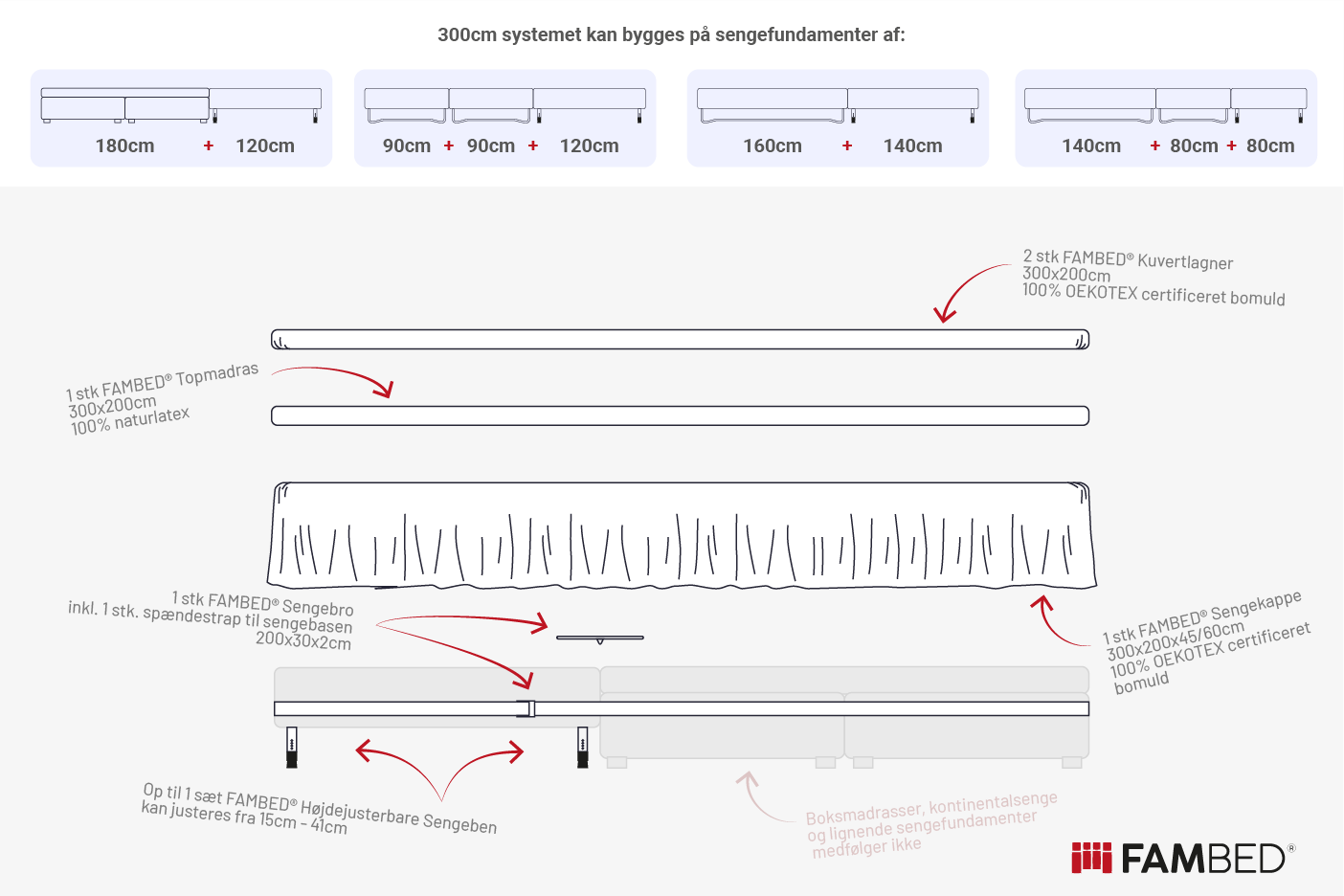 Systemet indeholder 1 x topmadras (300x200cm), 2 x lagner (300x200cm) i hvid, 1 x sengekappe (300x200cm) i valgfri farve, 1 x sengebrosystem, ét sæt højdejusterbare sengeben (4 ben)